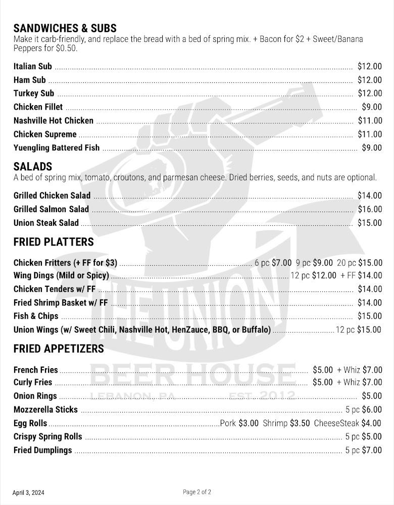 The Union Beer House features a diverse menu, appealing to various tastes. The cheesesteaks are a highlight, with options like the classic Philly, mushroom, and the exciting hoagie steak. Each cheesesteak offers hearty flavors at reasonable prices, averaging around $14.88. Burgers come highly recommended, especially the U.B.H. Smash Burger, praised for its juicy flavor.